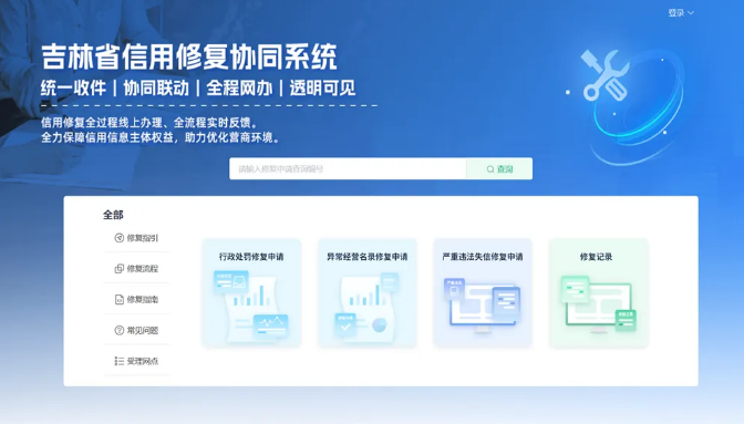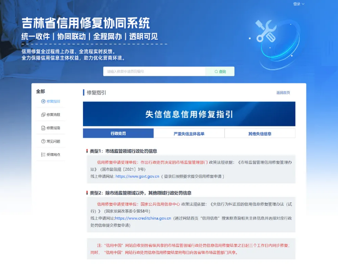 吉林省信用修复协同系统主要包含修复指引、修复流程、修复指南、常见问题、受理网点、行政处罚修复申请、异常经营名录修复申请、严重违法失信修复申请、修复记录九大修复板块。