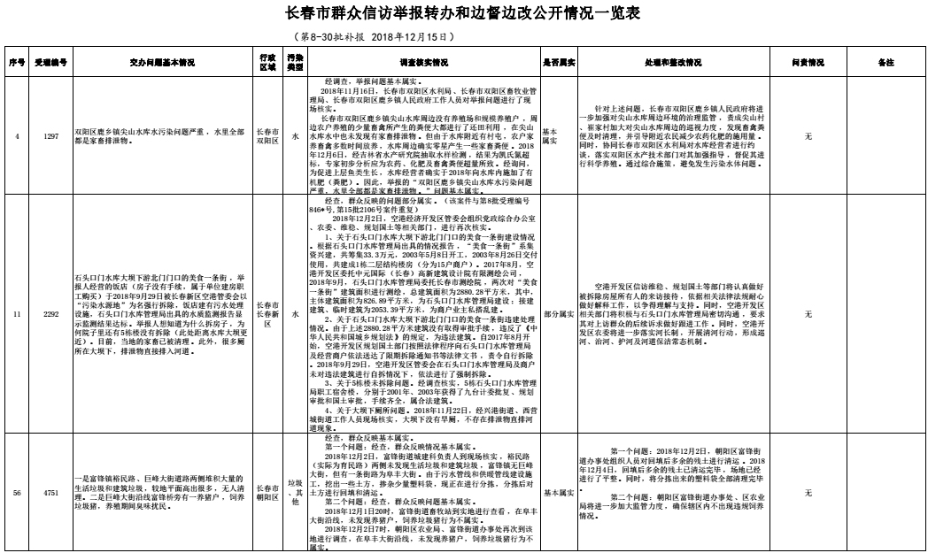 长春市群众信访举报转办和边督边改公开情况一览表(第8-30批补报 2018年12月15日)