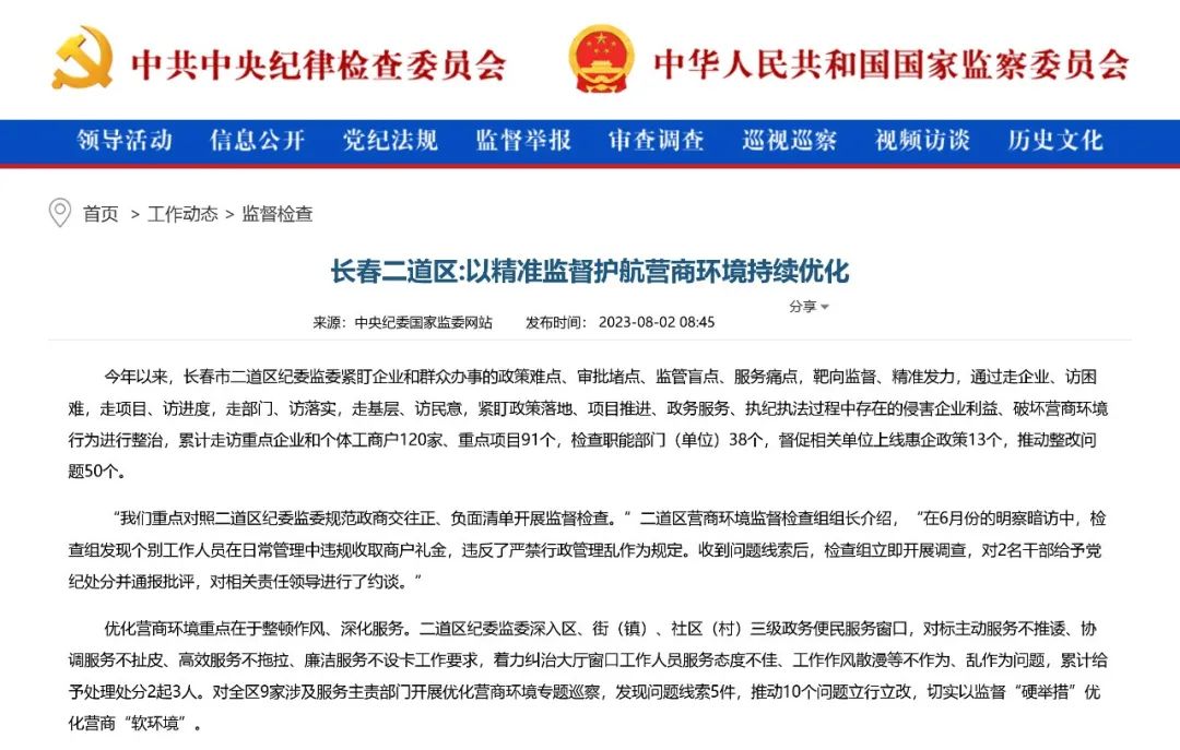 营商环境监督检查组组长介绍,“在6月份的明察暗访中,检查组发现个别工作人员在日常管理中违规收取商户礼金,违反了严禁行政管理乱作为规定。收到问题线索后,检查组立即开展调查,对2名干部给予党纪处分并通报批评,对相关责任领导进行了约谈。”