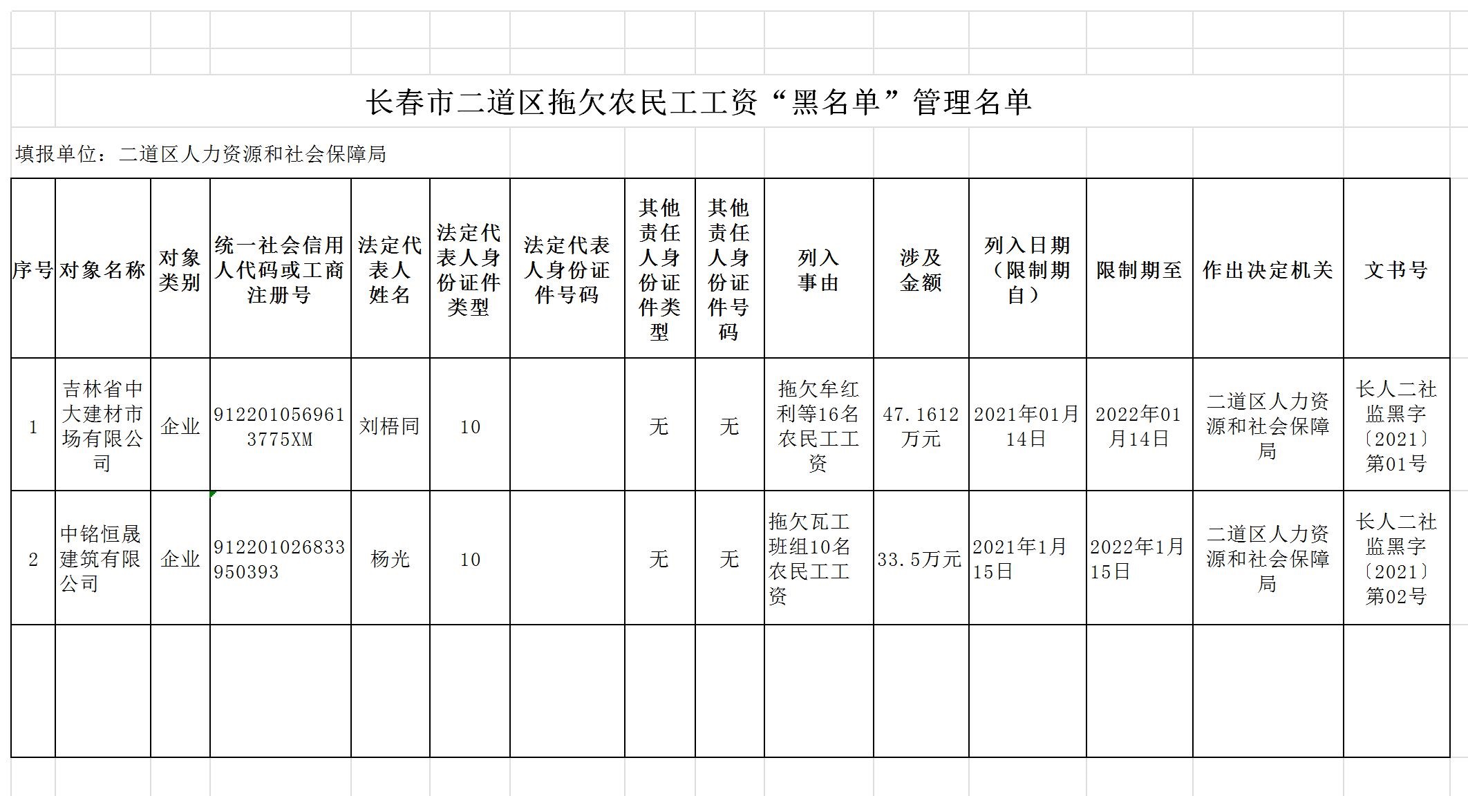 按照《吉林省人力资源和社会保障厅关于印发<吉林省拖欠农民工工资“黑名单”管理暂行办法实施细则>的通知》〔2018(67)〕文件规定,将存在重大劳动保障违法行为的吉林省中大建材市场有限公司、中铭恒晟建筑有限公司列入拖欠农民工工资“黑名单”,现予以向社会公布(详见附件)。
