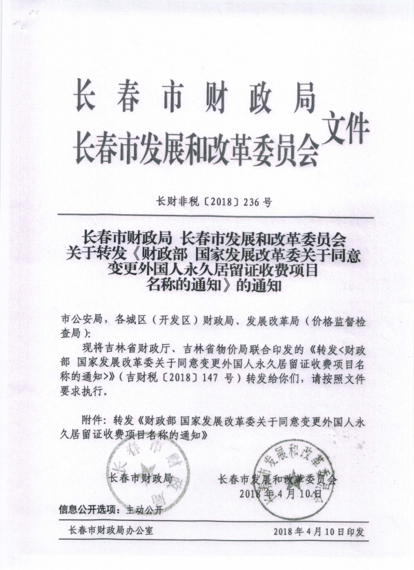 长春市财政局 长春市发展和改革委员会关于 转发《财政部 国家发展改革委关于同意变更外国人永久居住留证收费项目名称的通知》的通知