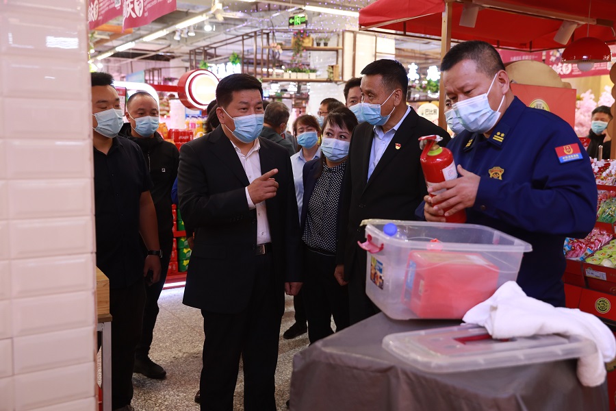 陈铁志书记同时查看了超市的消防应急箱、灭火器、消防水池、消防监控室等消防设备设施。在欧亚超市东盛店消防监控室内,陈铁志书记听取了超市工作人员关于消防自检程序的详细讲解,现场观看了超市火灾警报的模拟演练。他强调,企业要做到疫情防控和安全生产常态化管理,尤其是要落实消防安全主体责任和秩序管理,为群众营造安全有序的消费环境。